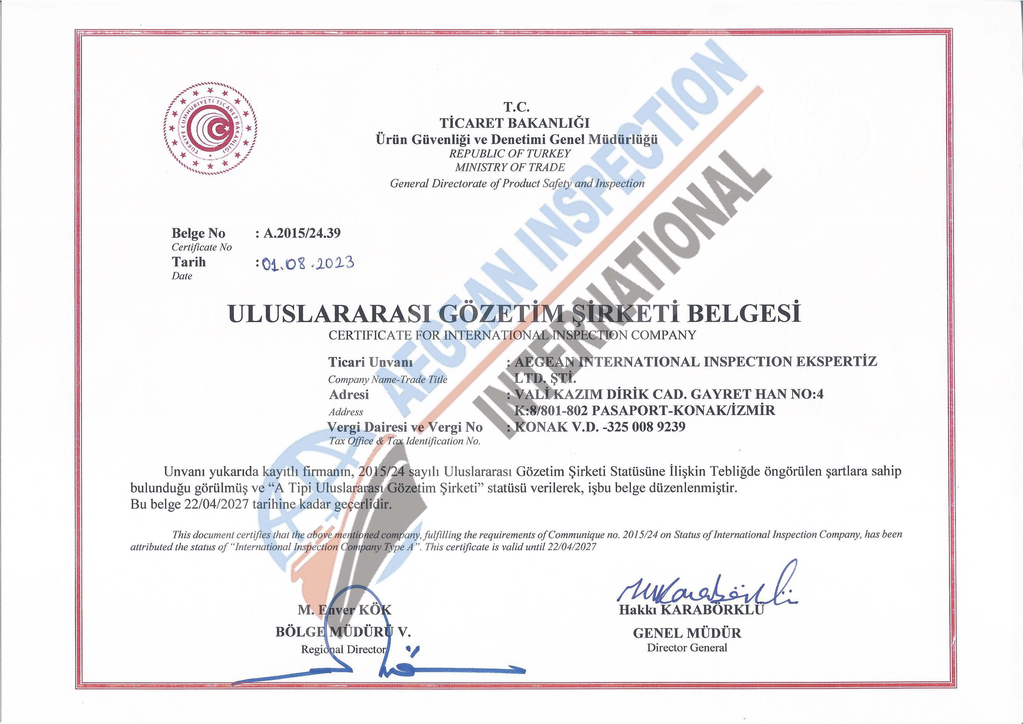 Our company has a certificate of “CLASS A INSPECTION COMPANY” which is given by TURKAK Turkish Accreditation Agency after audits.