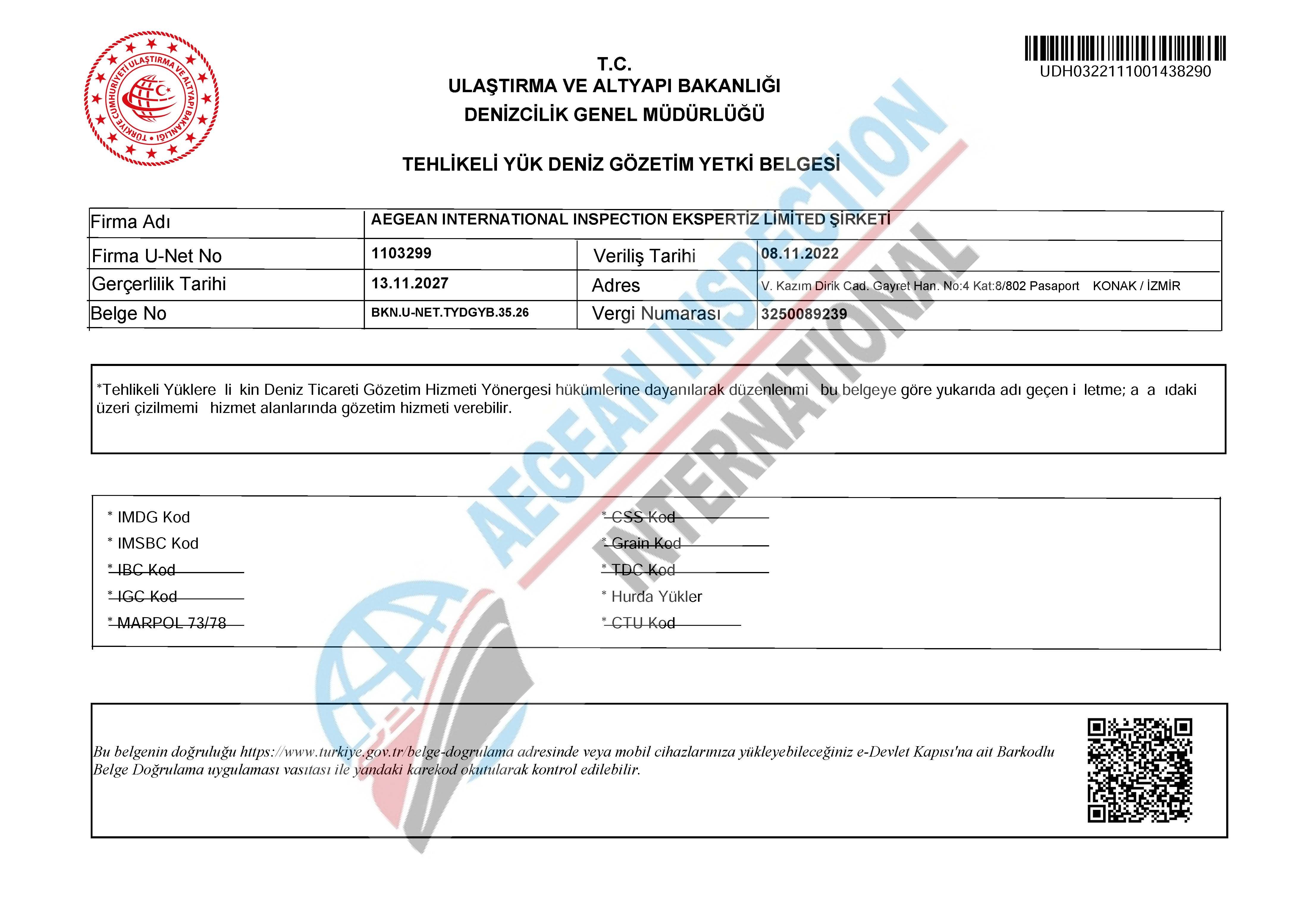 Our company has the certificates within the scope of the Maritime Trade Inspection Services Implementation Directive, Maritime Trade Inspection Services Regulation, Maritime Trade Inspection Service Directive on Dangerous Cargo and the Procedures / Principles regarding the International Inspection Companies to Perform Radiation Measurements.