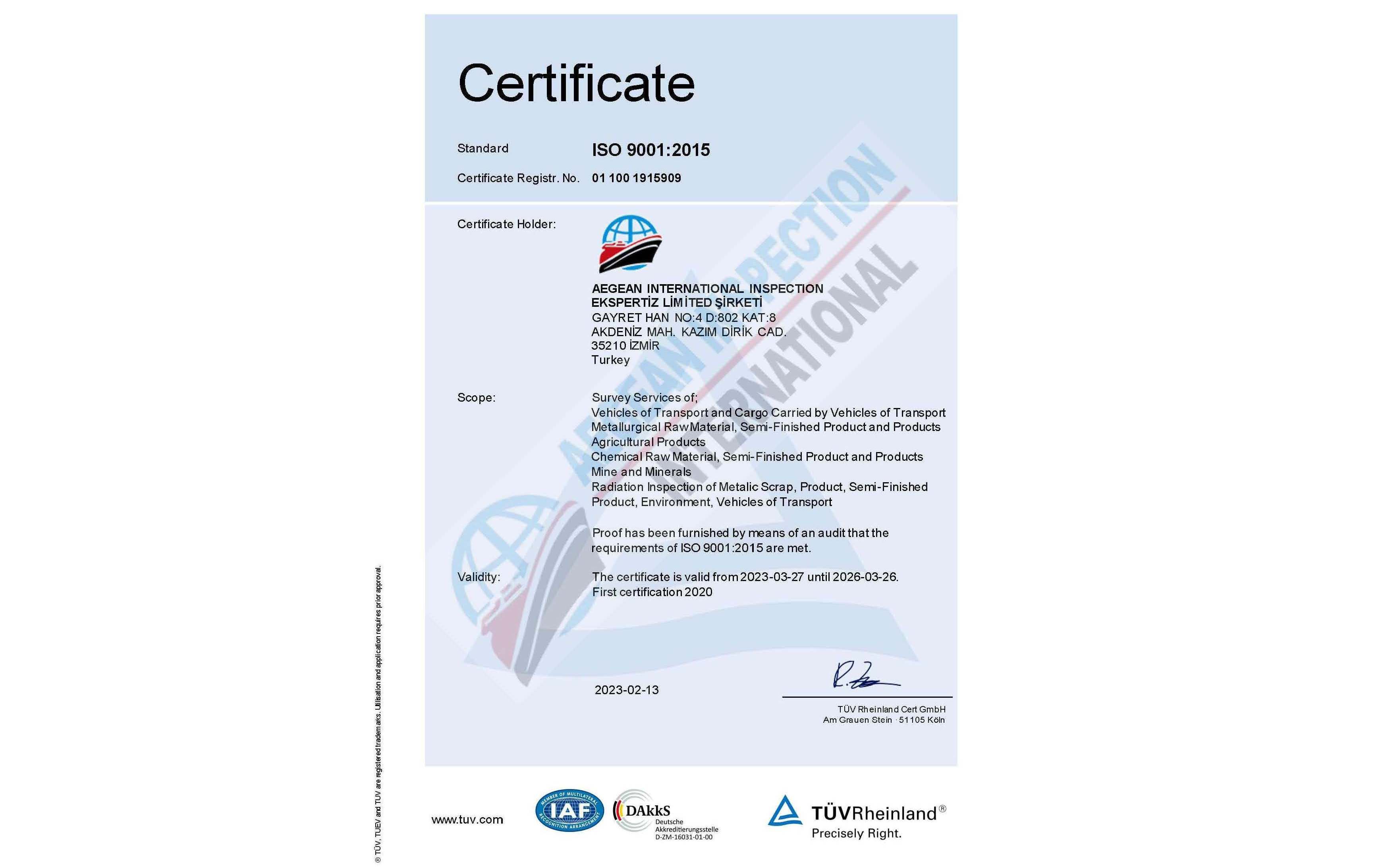 Kalite Yönetim Sistemini etkin kullanan Aegean International Inspection Ekspertiz Ltd. Şti. ISO 9001:2015 Sertifikasına sahiptir.