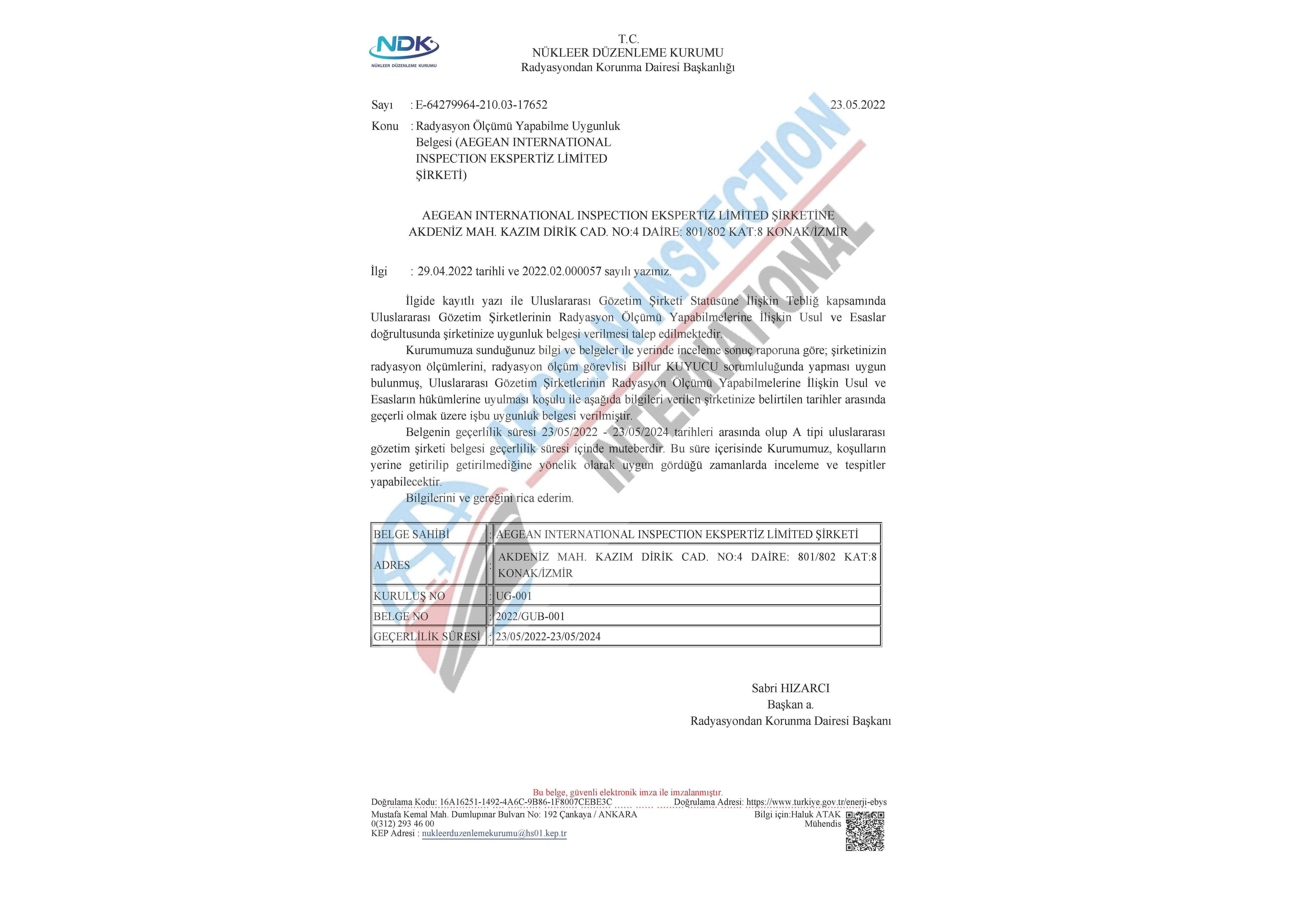Firmamız, Deniz Ticareti Gözetim Hizmetleri Uygulama Yönergesi, Deniz Ticareti Gözetim Hizmetleri Yönetmeliği, Tehlikeli Yüklere İlişkin Deniz Ticareti Gözetim Hizmeti Yönergesi ve Uluslararası Gözetim Şirketlerinin Radyasyon Ölçümü Yapabilmelerine İlişkin Usul ve Esaslar kapsamında belgelere sahiptir.