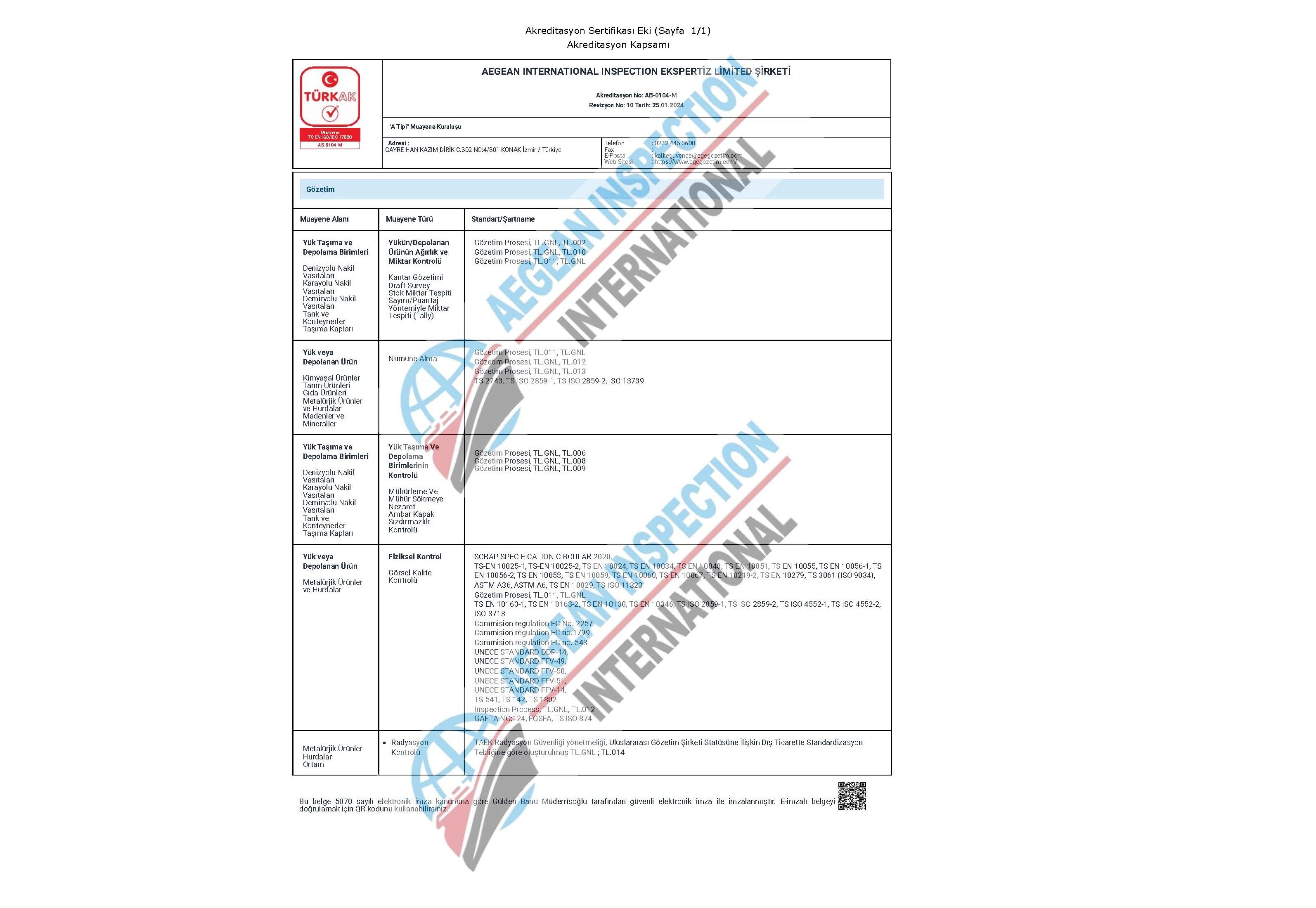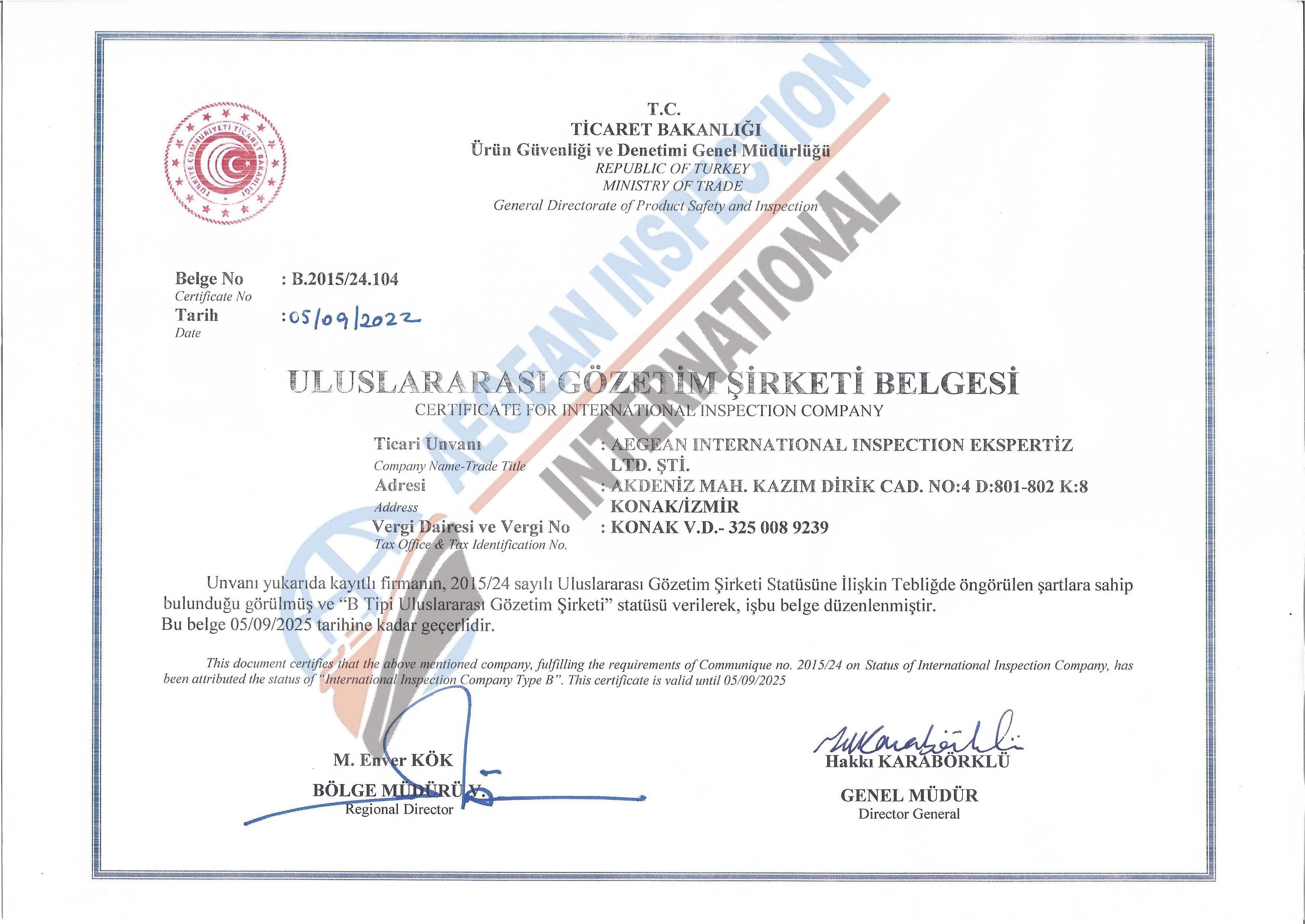 Şirketimiz, Ekonomi Bakanlığı'nın 31/12/2014 tarih ve 29222 sayılı Resmi Gazetesi'nde yayınlanan Ürün Güvenliği ve Denetimine İlişkin 2015/24 nolu Tebliğine göre TURKAK - ISO/IEC 17020:2012 akreditasyonu ile "A SINIFI GÖZETİM FİRMASI" sertifikasına sahiptir.