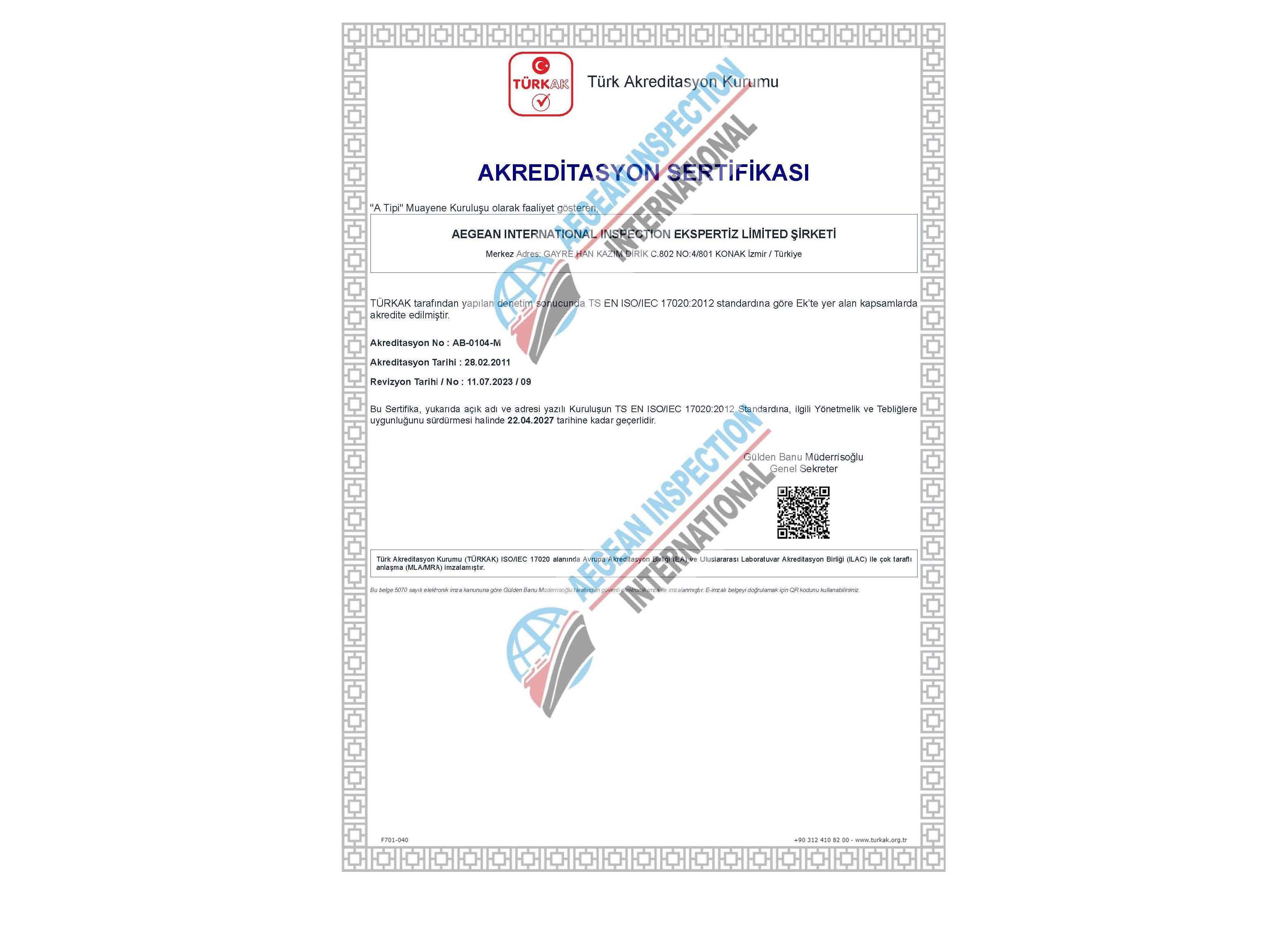 Our company has a certificate of “CLASS A INSPECTION COMPANY” which is given by TURKAK Turkish Accreditation Agency after audits.